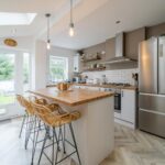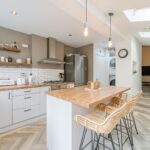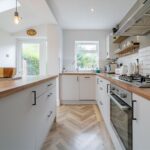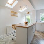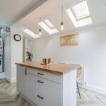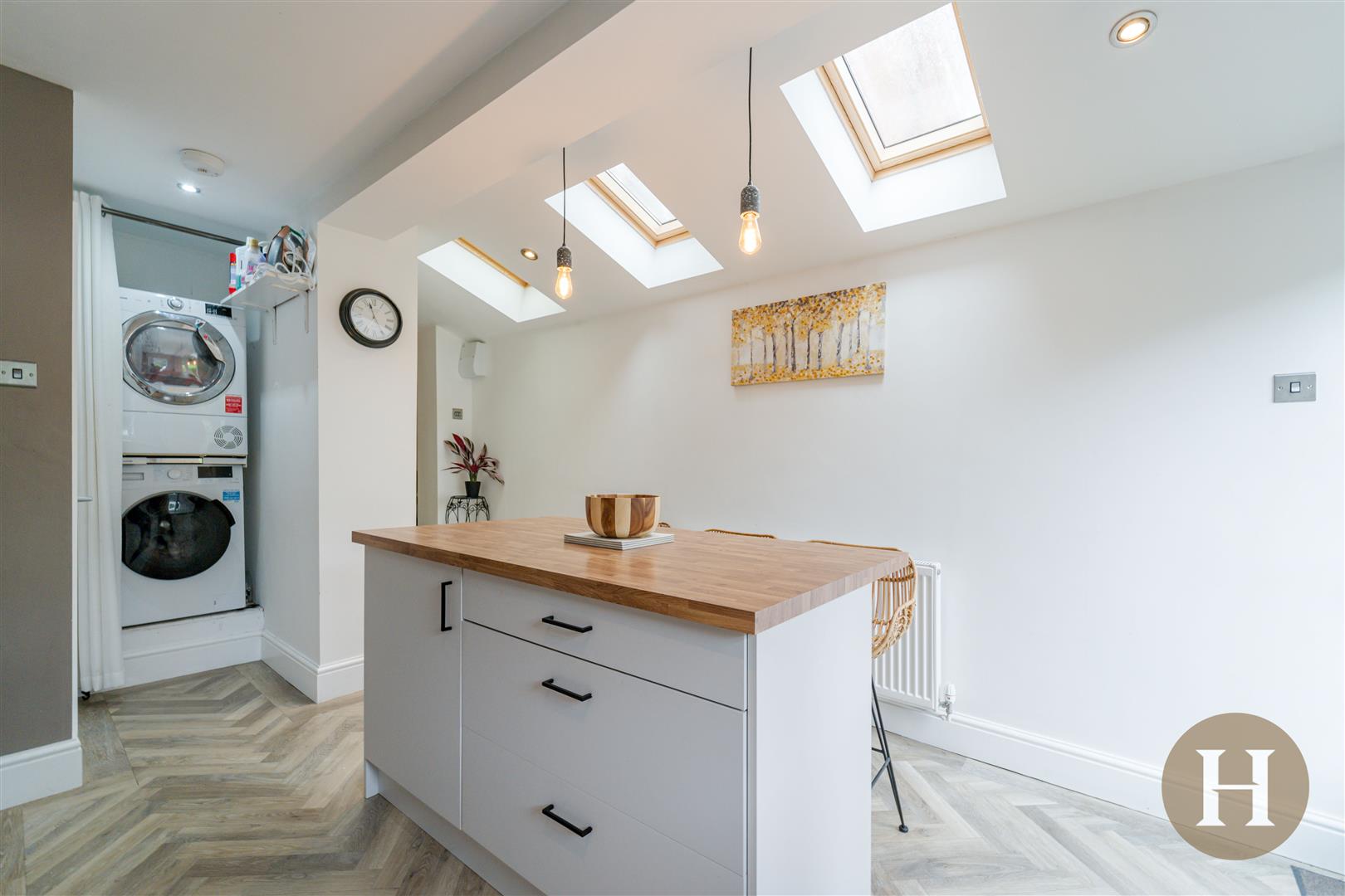 Modern fitted kitchen with a range of base and wall units, including integrated dishwasher and oven. Three skylights, window to the rear elevation and patio door leading to the garden. Boasting kitchen island, partially tiled splashbacks and access to utility area.