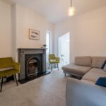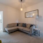 Modern lounge with opaque window to the side elevation, gas fired feature fireplace, central heating radiator and ceiling light point. Access to kitchen and stairs to first floor.