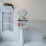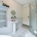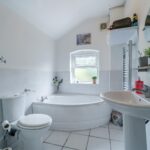Family bathroom with corner bath, walk in shower cubicle, low level flush WC and hand wash basin. Opaque window to the rear elevation, towel radiator and ceiling light point.