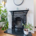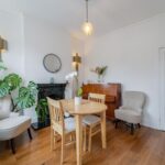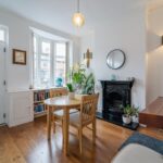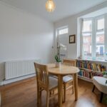 Period dining room boasting feature fireplace, bay window to the front elevation allowing for extra storage space or seating, central heating radiator and ceiling light point.
