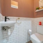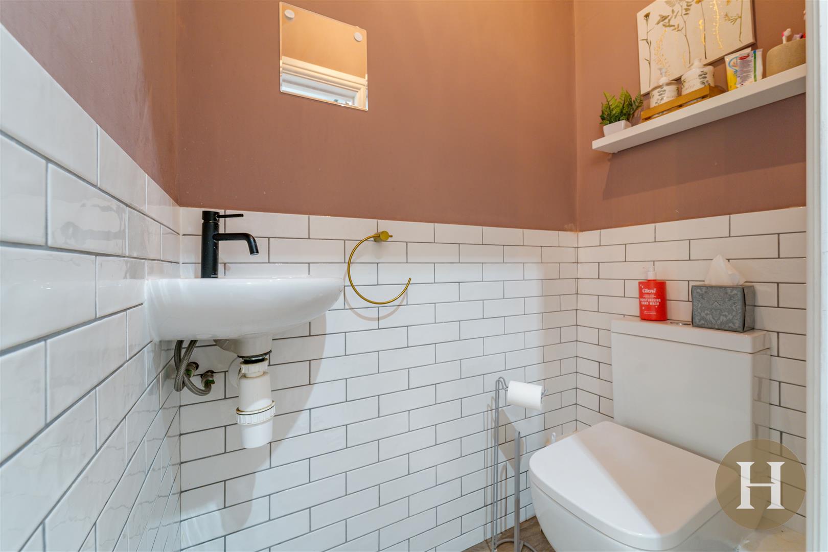 Partially tiled walls, low level flush WC, hand wash basin and ceiling light point.