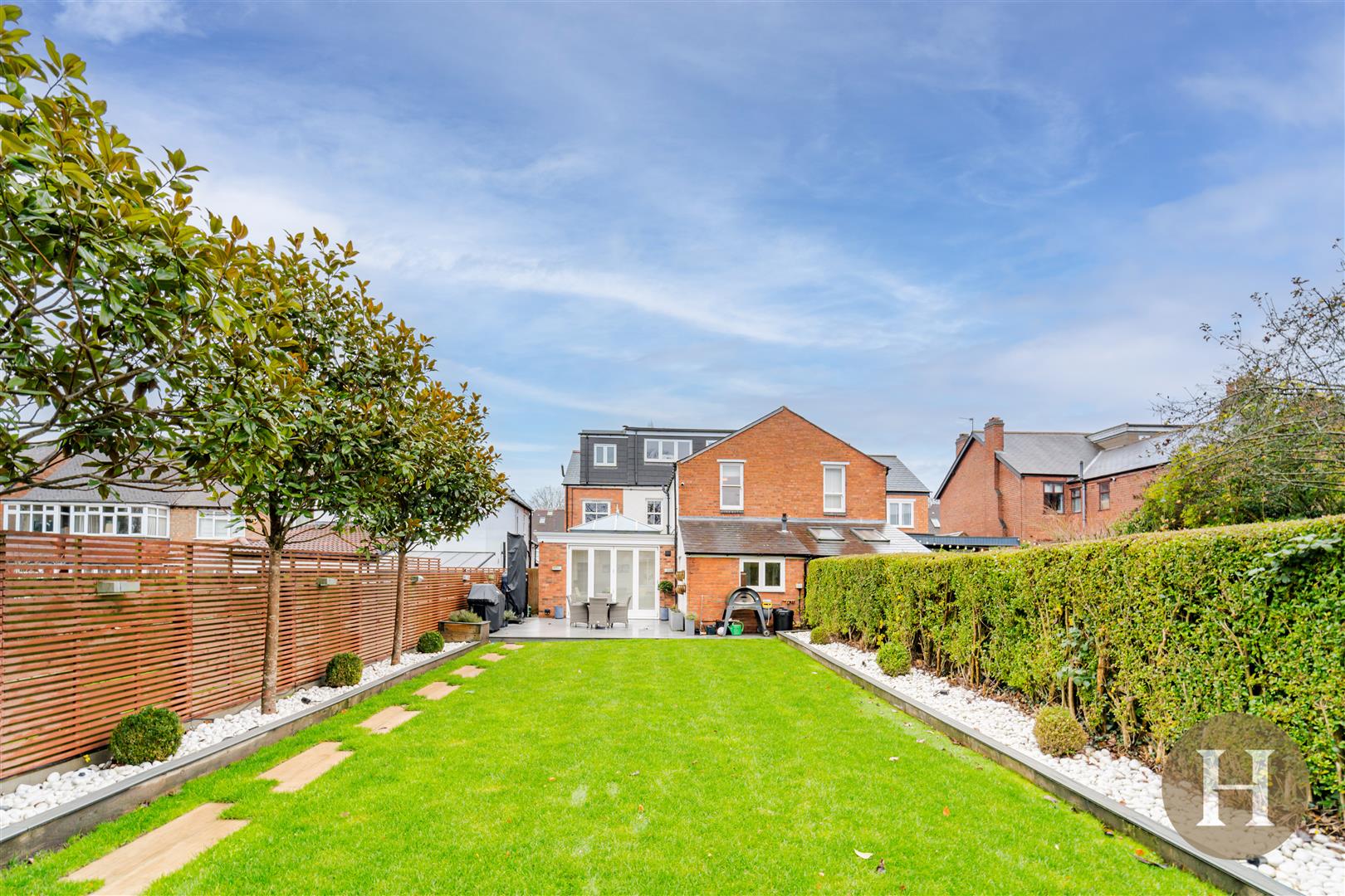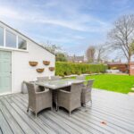 Beautifully landscaped private garden, predominantly laid to lawn and boasting two decked patio areas.