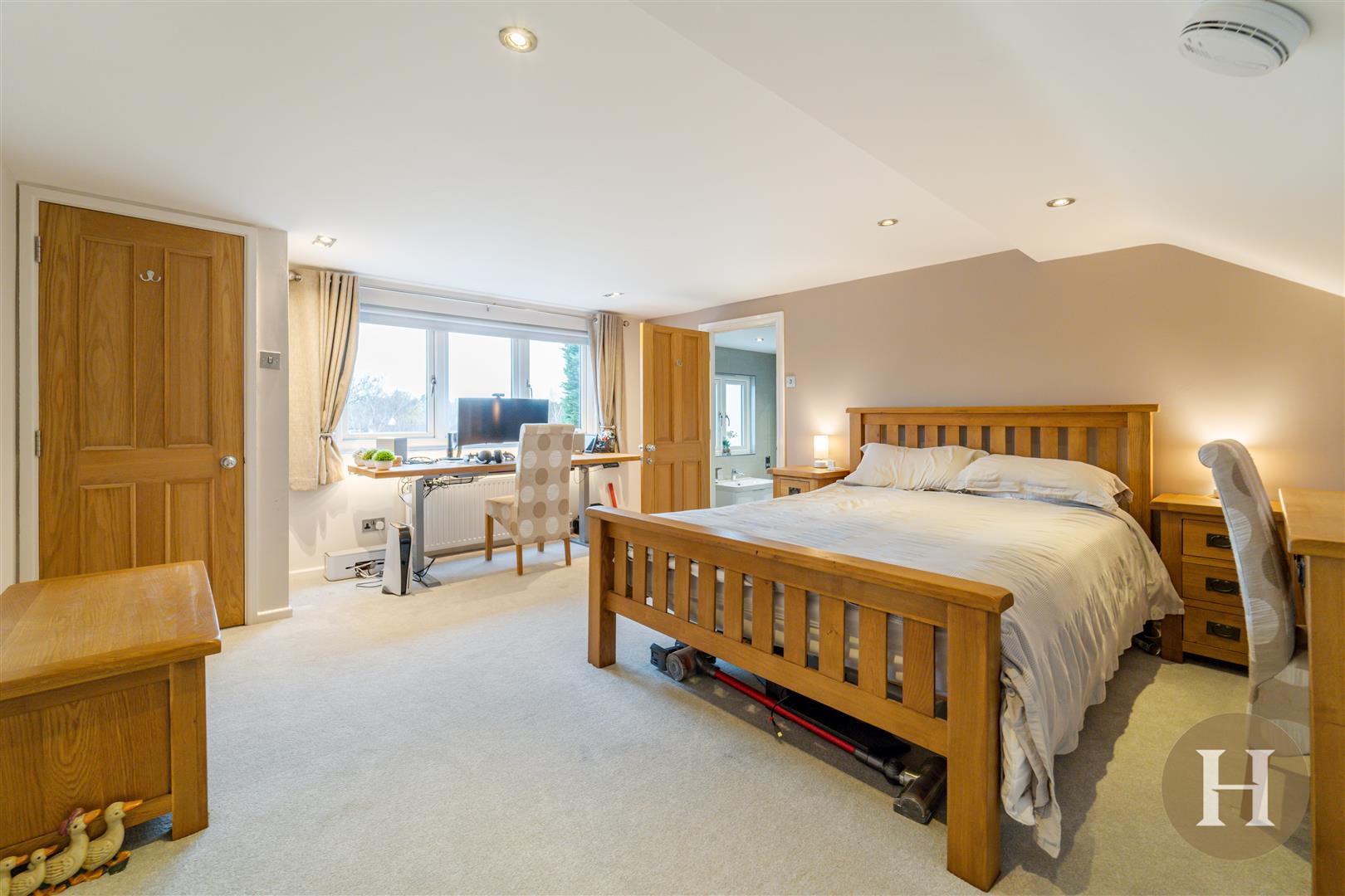 Extensive master suite, boasting bay window to the front elevation and additional sash window. Carpeted flooring, ceiling light point and central heating radiator. Access to master ensuite.
