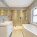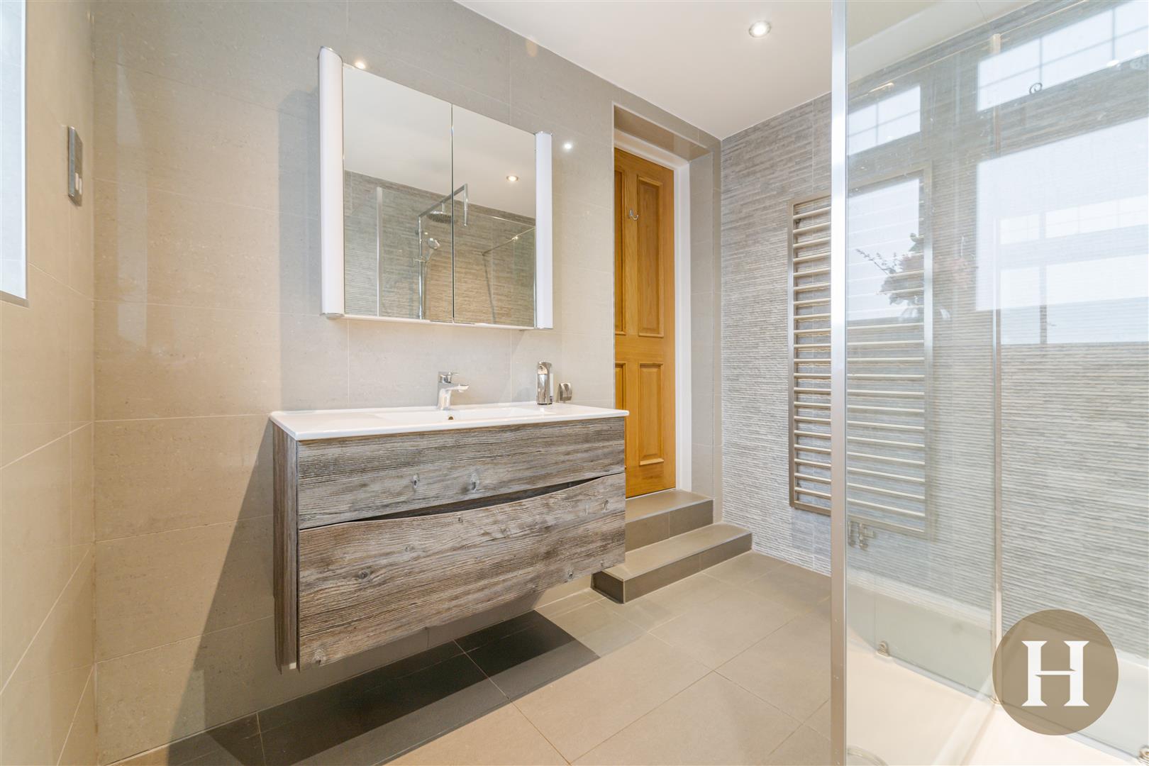 Spacious and modern family bathroom with floor to ceiling tiling. Large walk in shower cubicle, additional bath, low level flush WC and vanity unit. Ceiling spotlights, towel radiator and two sash windows to the side elevation.