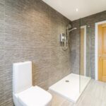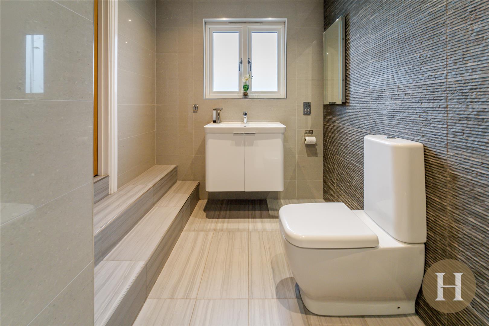 Floor to ceiling tiled ensuite, boasting large walk in shower cubicle, low level flush WC and floating vanity unit. Opaque glazed window to the front elevation, ceiling spotlights and towel radiator.