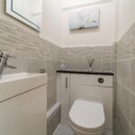 Partially tiled guest WC, low level flush WC, vanity unit, ceiling light point and extractor fan.