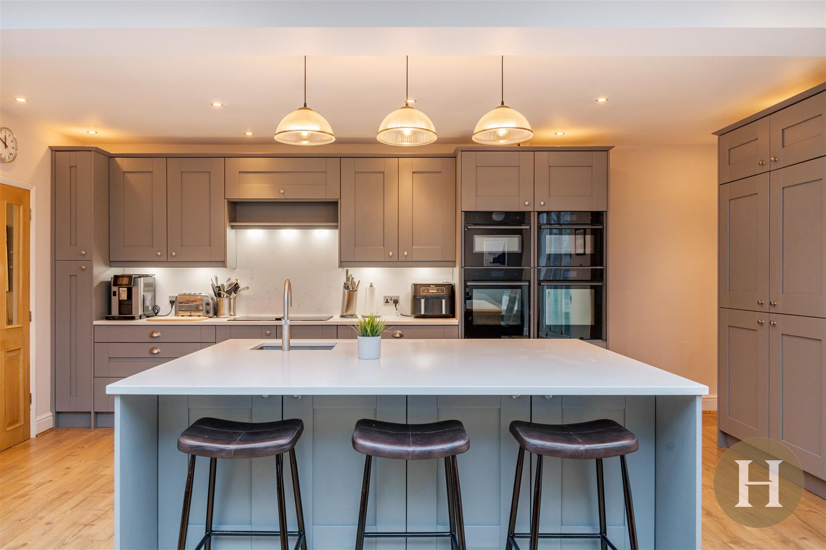 Being the main focal point of the property, benefitting from a rear extension the kitchen boasts a range fitted base and wall units. The wall units further benefit from downlighters. Substantial kitchen island, with undercounter storage and breakfast bar. The kitchen offers integrated appliances, sink and drainer unit. Ceiling spotlights and ceiling light points, with the large ceiling lantern allowing for natural light to flood the room. Bi-fold doors lead to the rear garden, two windows to the side elevation, stained glass window between the lounge and central heating radiator.