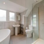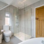 Obscure glazed window to front and side elevation, tiled walls and flooring. Walk in mains shower cubicle., low level flush WC, handwash basin and towel radiator. Further benefitting from corner bath and ceiling spotlights.