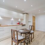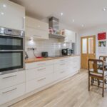 Having a range of wall and base gloss white fronted storage cupboards, Amtico flooring, French doors leading to garden, electric hob with extractor over, integrated appliances such as dishwasher, double oven and fridge/ freezer.