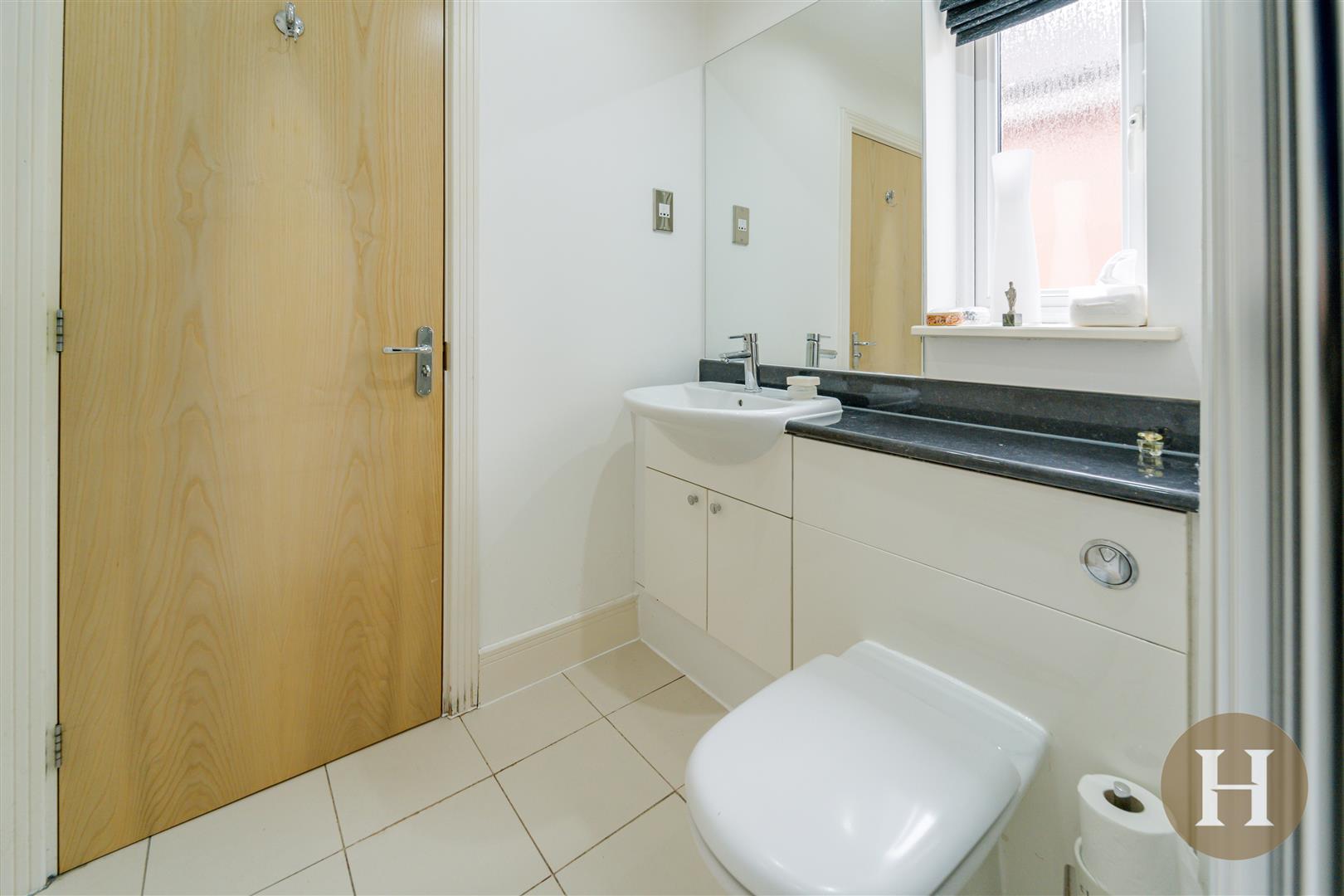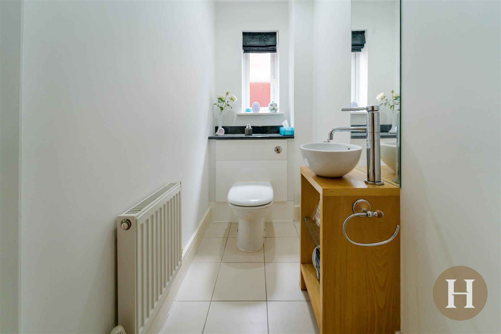 Convenient guest cloak room with low level flush WC, vanity unit and central heating radiator. Tiled flooring, ceiling light point and obscure glazed window to the side elevation.