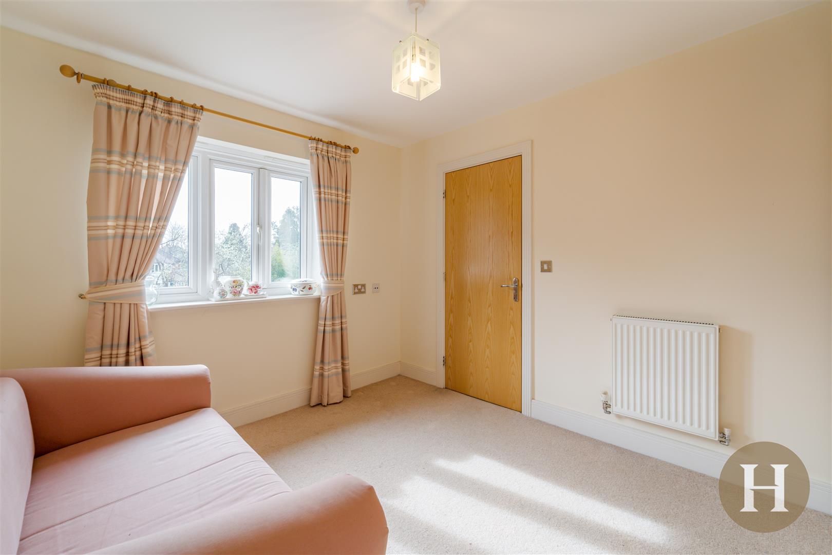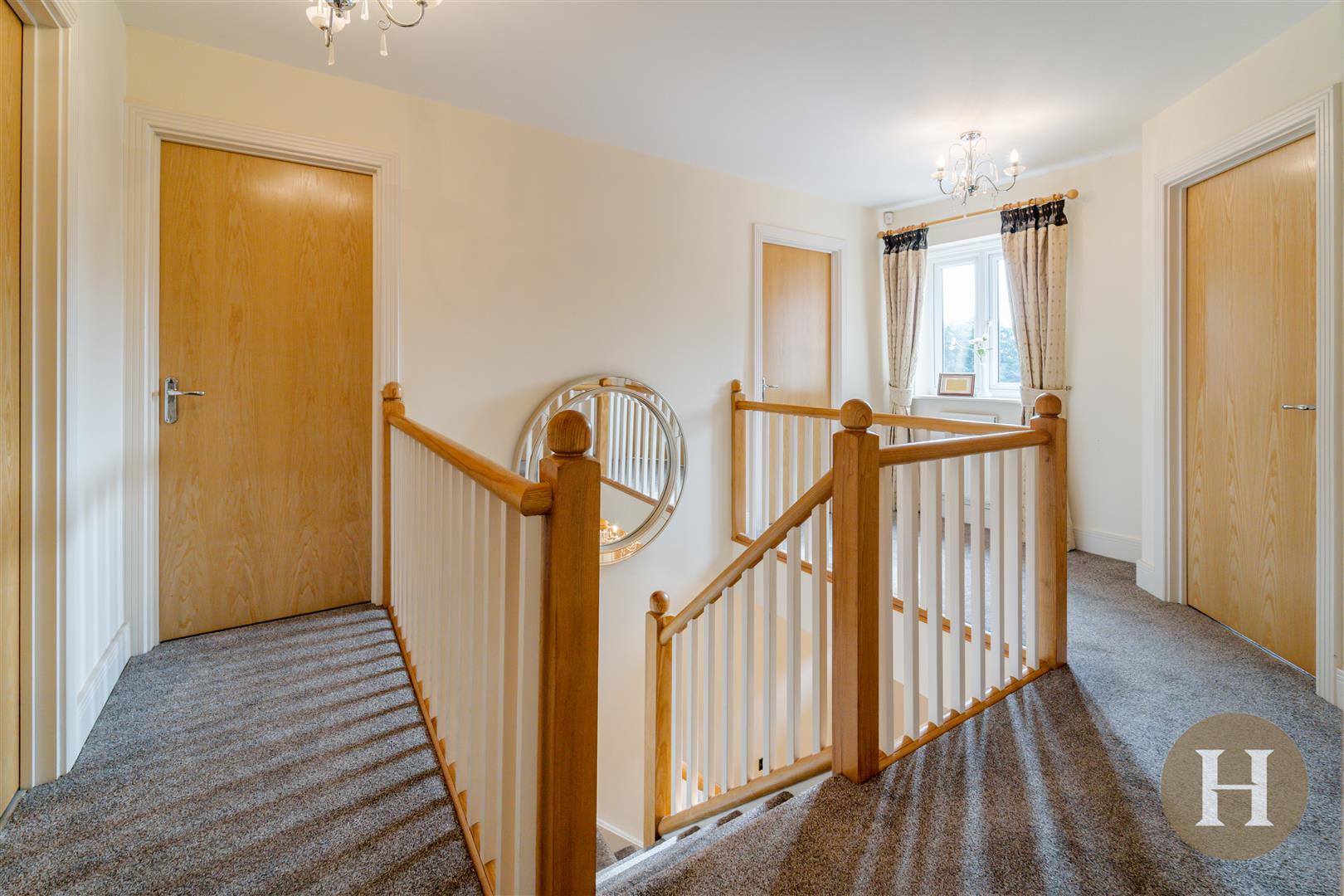 The landing offers ample light, space and access to all first floor accommodation. With two central heating radiators and double glazed windows to the front elevation, ceiling light points and loft access.