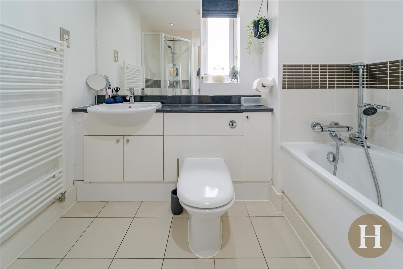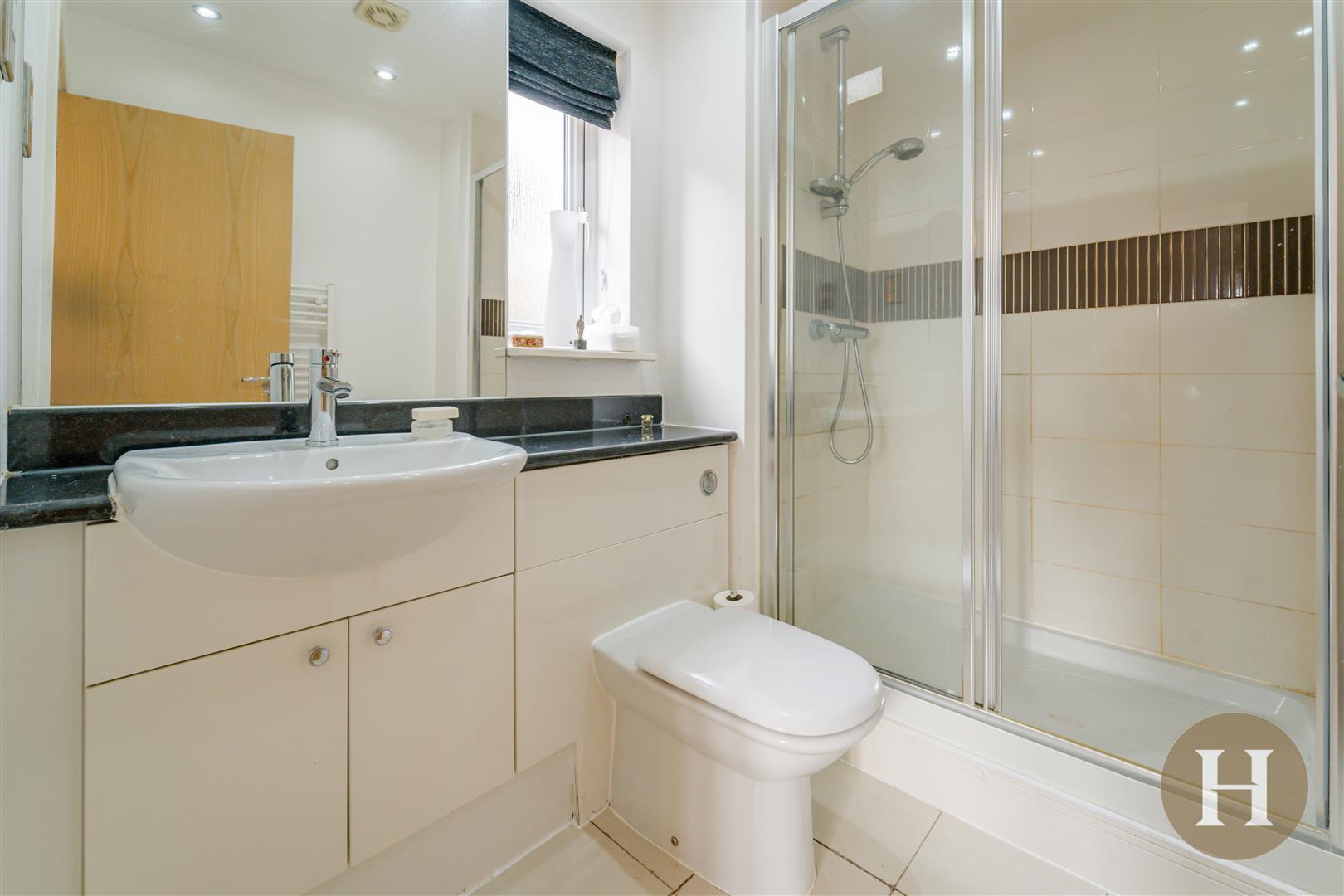 Modern en-suite shower room, with low level flush and vanity combi unit. Sliding doors mains shower cubicle, obscure glazed window to the side elevation and towel radiator. Ceiling spotlights and tiled flooring.