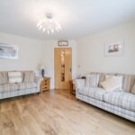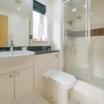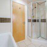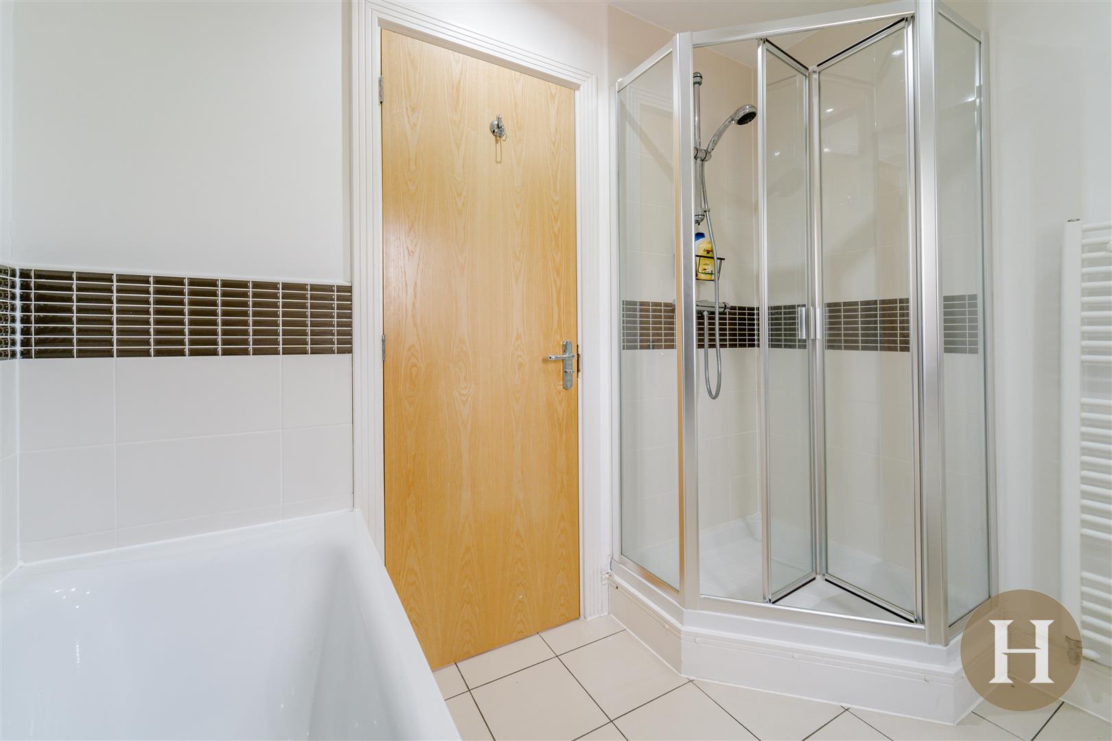 The family bathroom offers walk in shower cubicle and separate fitted bath, complete with shower attachment. Partially tiled walls, tiled flooring and low level flush WC and sink combi unit. Ceiling spotlights and towel radiator.