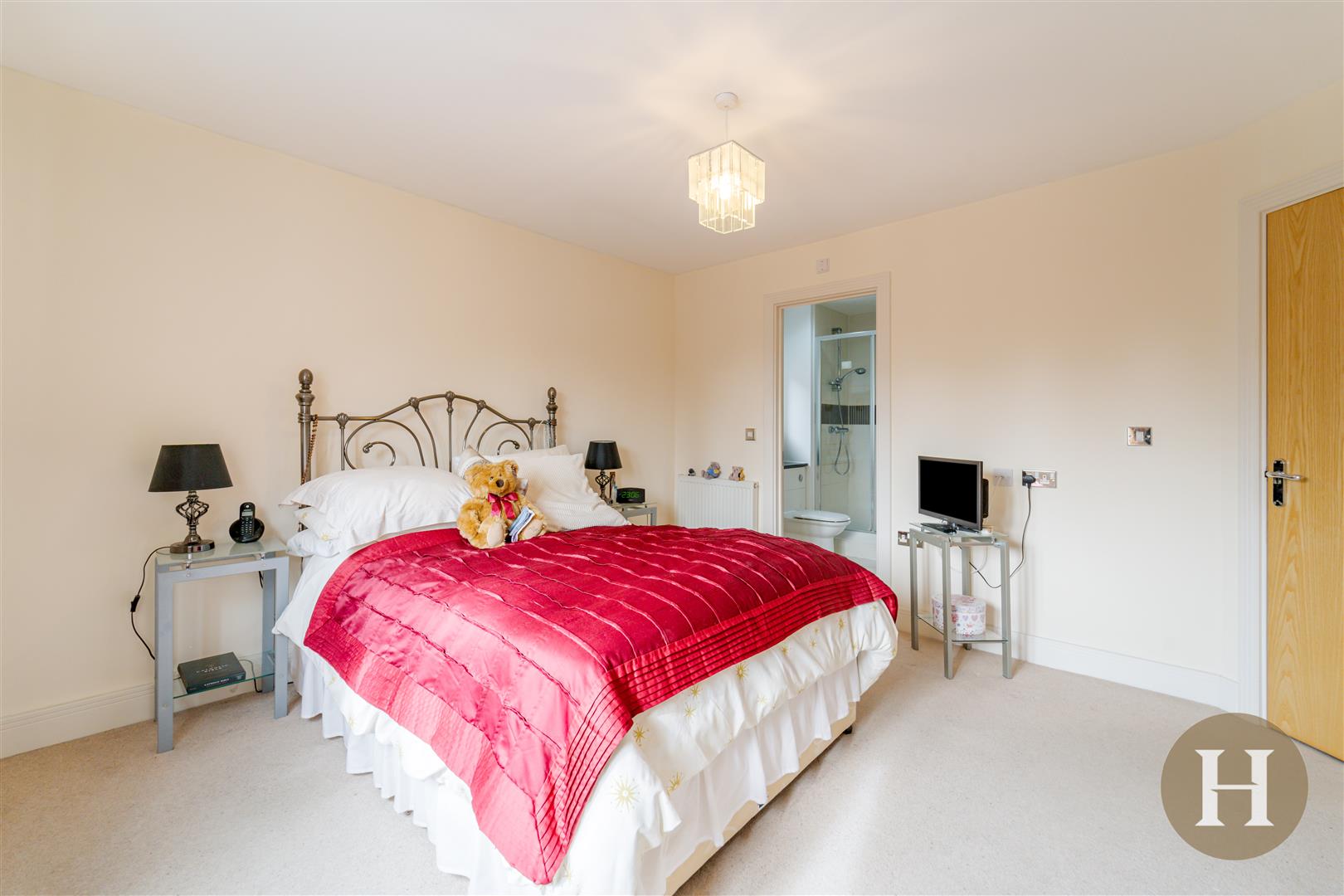 Large master suite, offering fitted wardrobes, double glazed windows to the front elevation, central heating radiator, carpeted flooring and access to master en-suite.