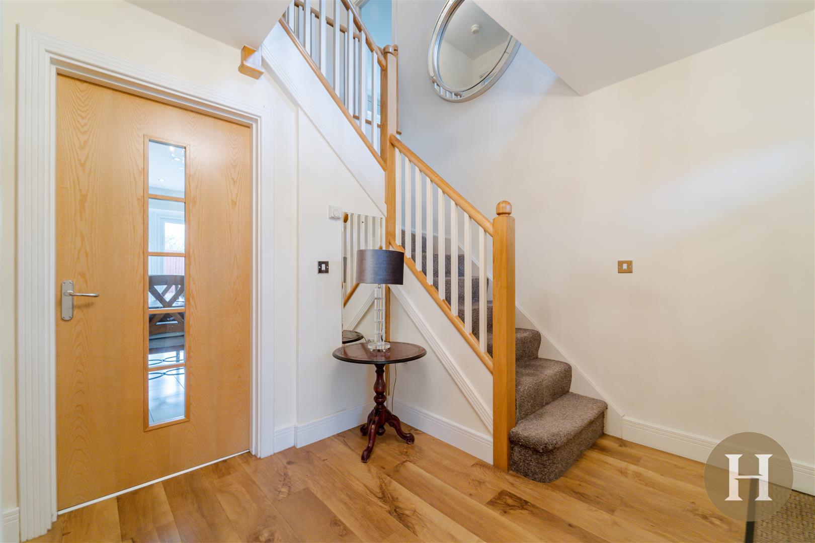Welcoming entrance hallway, benefitting from partially glazed front door, central heating radiator, ceiling light point, alarm control panel and stairs to first floor accommodation.