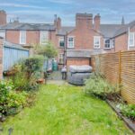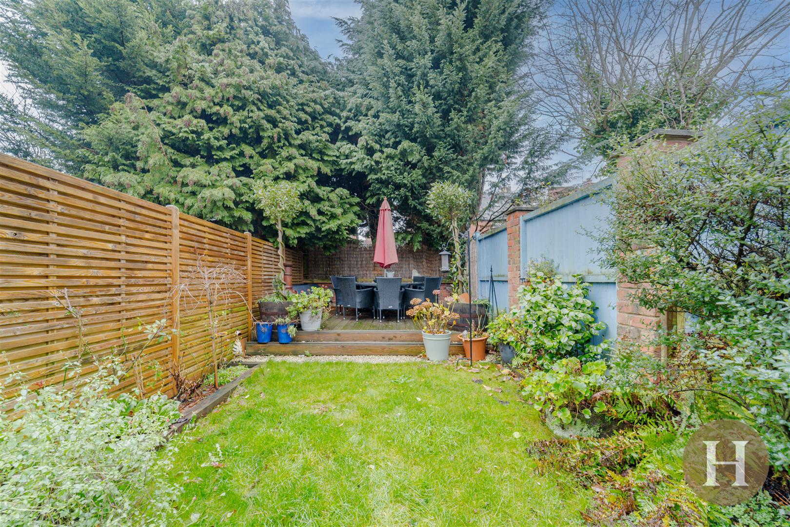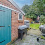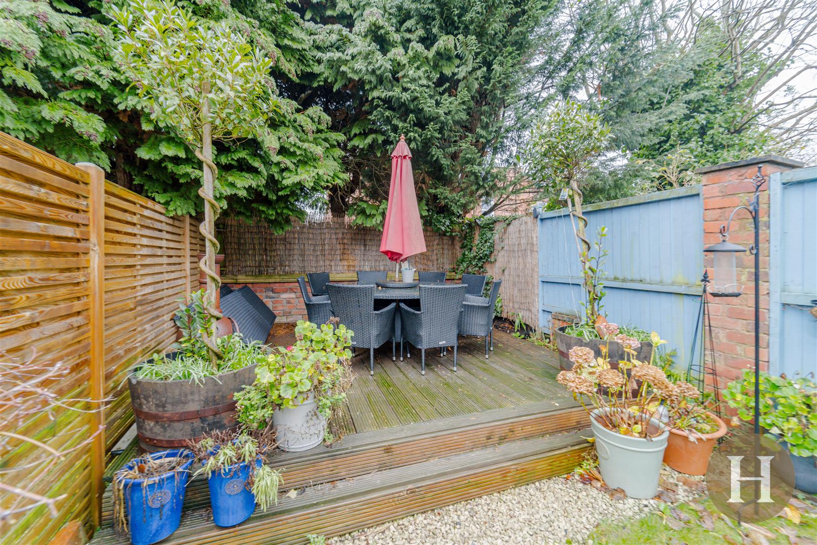 Private garden with traditional outhouse, blue brick paving and predominantly laid to lawn. Rear decking area and fenced boundaries.