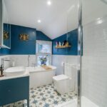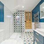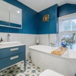Modern bathroom suite boasting freestanding bath and shower attachment. Walk in shower cubicle, low level flush WC, vanity unit and towel radiator. Partially obscure glazed window to the rear elevation, tiled flooring and walls, ceiling spotlights. The bathroom further benefits from underfloor heating.