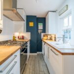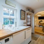 Comprising sink unit and drainer with hot and cold mixer tap over, range of base and wall units, solid block wood work surface, five ring stainless steel gas range style oven, extractor hood, concealed under counter lighting, built in washing machine and dishwasher, housing boiler, partially tiled walls, back door and window to side elevation.