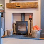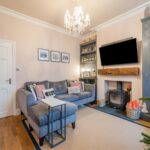 Modern lounge boasting bay window to the front elevation with bespoke fitted shutters. Feature fireplace with working log burner, fitted shelving set within the alcoves, central heating radiator, coving and ceiling rose.