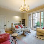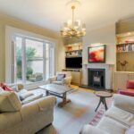 Being at the focal point is a feature fireplace with marble mantle, slate hearth beneath and log burner. Original wood flooring, cornice, ceiling light point, central heating radiator and wall light. Full height sash style window to the rear elevation with shutters. Further benefitting from fitted shelving and cabinets with downlighters.