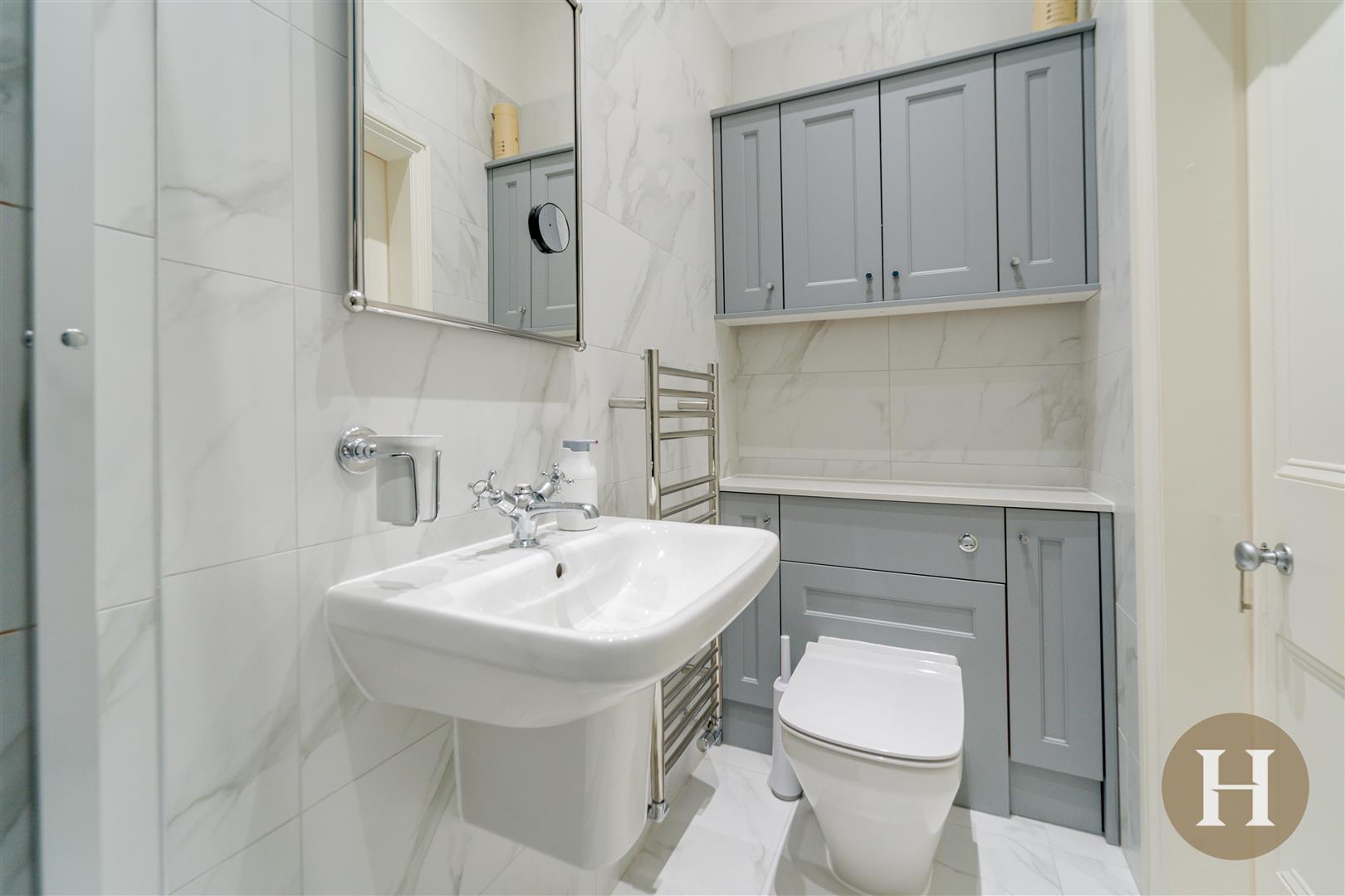 High level traditional WC, floating hand wash basin and traditional towel radiator. Sash style window to the side elevation, ceiling light point, tiled flooring and partially tiled walls.