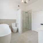 Spacious bathroom suite, boasting freestanding bath with traditional taps and shower attachment. Walk in shower cubicle, low level flush WC and floating vanity unit. Light up mirror, wall lights, ceiling light point and sash style window to the front elevation. Tiled flooring, partially tiled walls, towel radiator and underfloor heating.