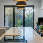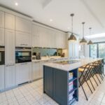 A comprehensive modern fitted kitchen, boasting a range of base and wall units. Integrated appliances, the mirrored splashback is complimented with under unit downlighters. The focal point being the substantial kitchen island, offering further storage. Sash style window to the side elevation, ceiling spotlights and bi-fold doors lead to the rear garden. The spacious kitchen further allows for seating area, complete with floating unit, ceiling lantern and underfloor heating.