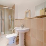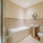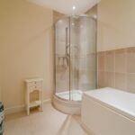 Partially tiled bathroom suite offering mains shower cubicle, bath, low level flush WC and hand wash basin. Ceiling spotlights and extractor fan.
