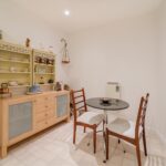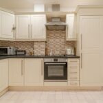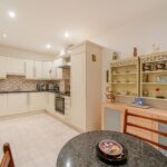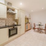 Fitted kitchen with a range of base and wall units, including integrated appliances, extractor over and partially tiled splashbacks. With ceiling spotlights and electric heater, the spacious kitchen further allows for dining area.