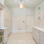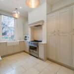 Newly fitted kitchen having a range of base and wall units, tiled flooring and window to the front elevation.