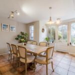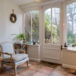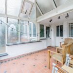 Spacious conservatory with quarry tiled flooring and double doors leading to the garden.