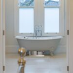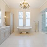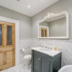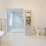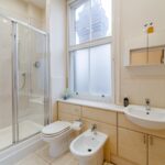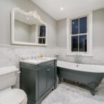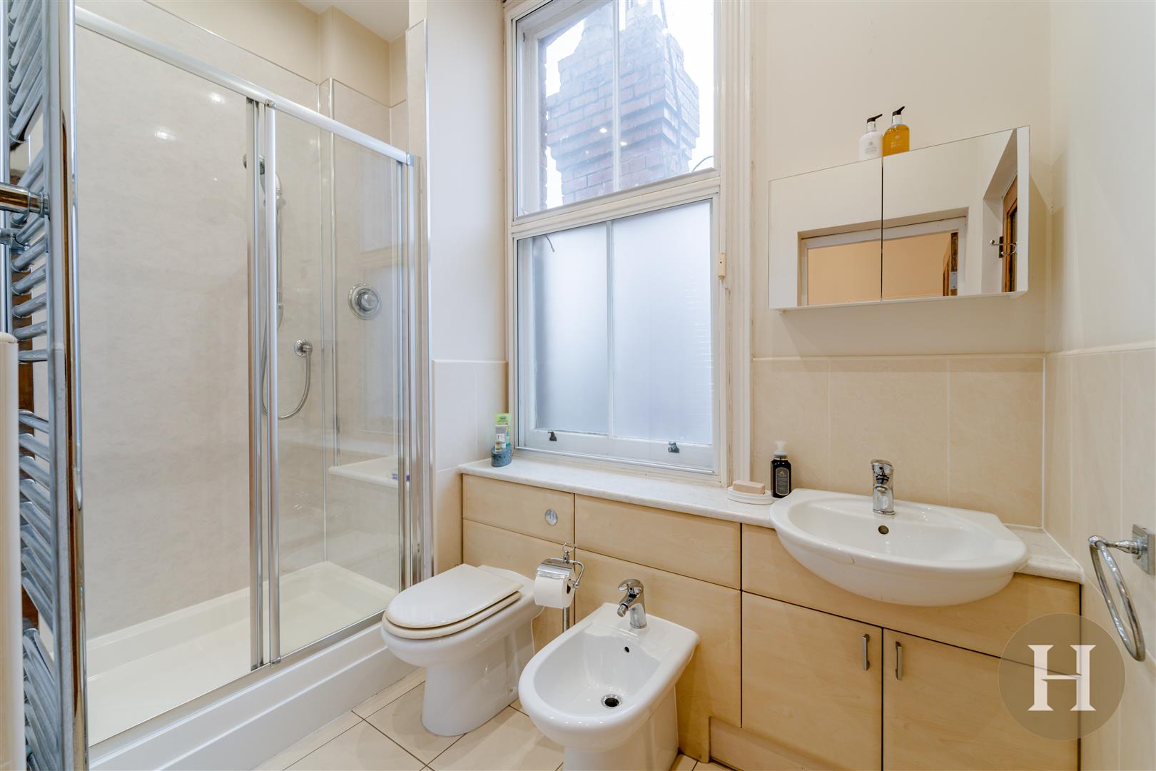 Spacious and modern ensuite boasting freestanding bath and additional walk in shower. Fitted vanity unit with double sinks, traditional towel radiator and traditional radiator. Ceiling light point, tiled flooring and opaque sash style windows.