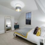 Modern ensuite with floor to ceiling tiles, walk in mains shower cubicle and floating hand wash basin. Concealed low level flush WC, towel radiator and medicine cabinet.