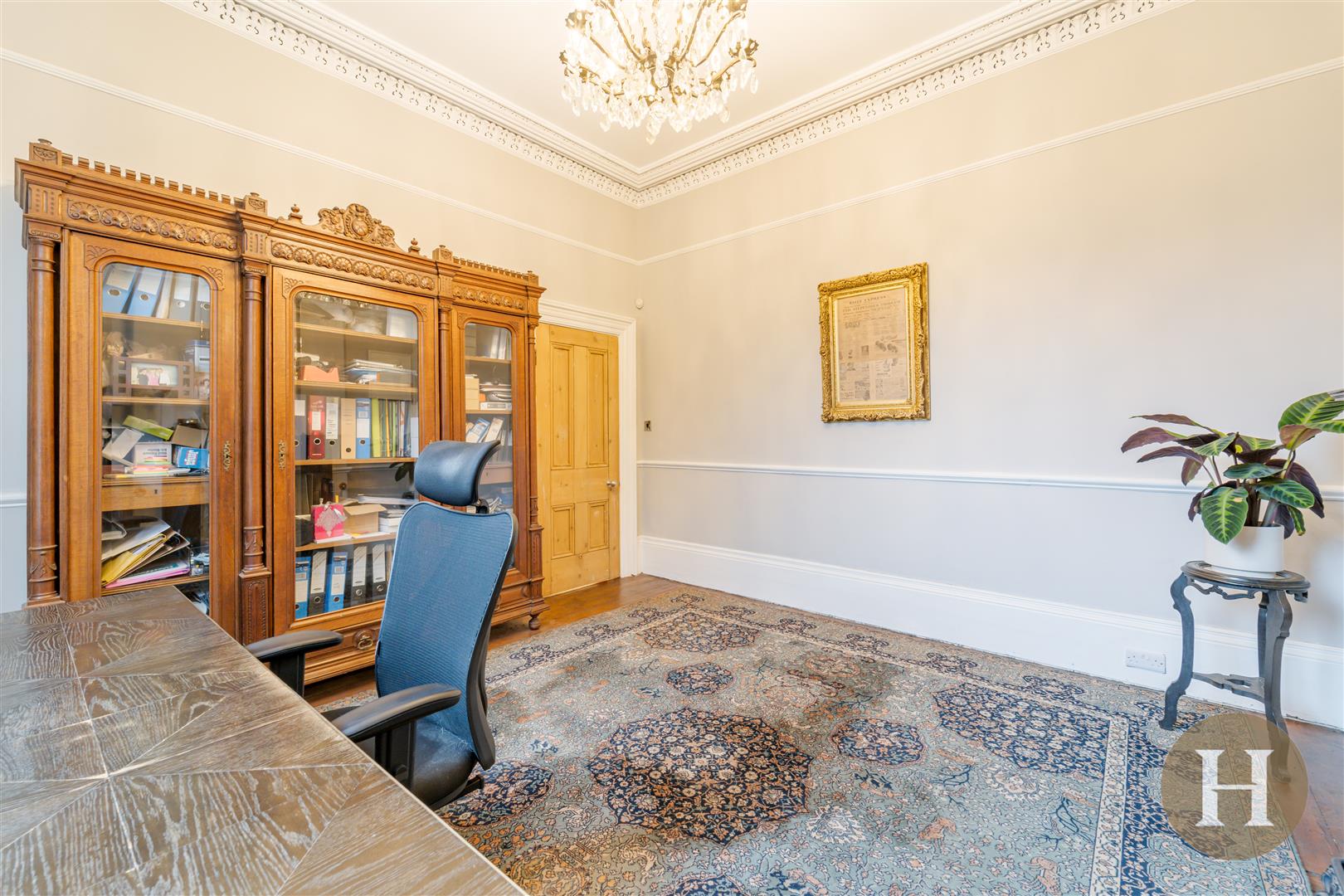 Spacious multi purpose room currently being used as a home office, with feature Oak fireplace and bay window to the front elevation. Ceiling light point with Rose and decorative coving. Traditional style radiator and fitted shutters.