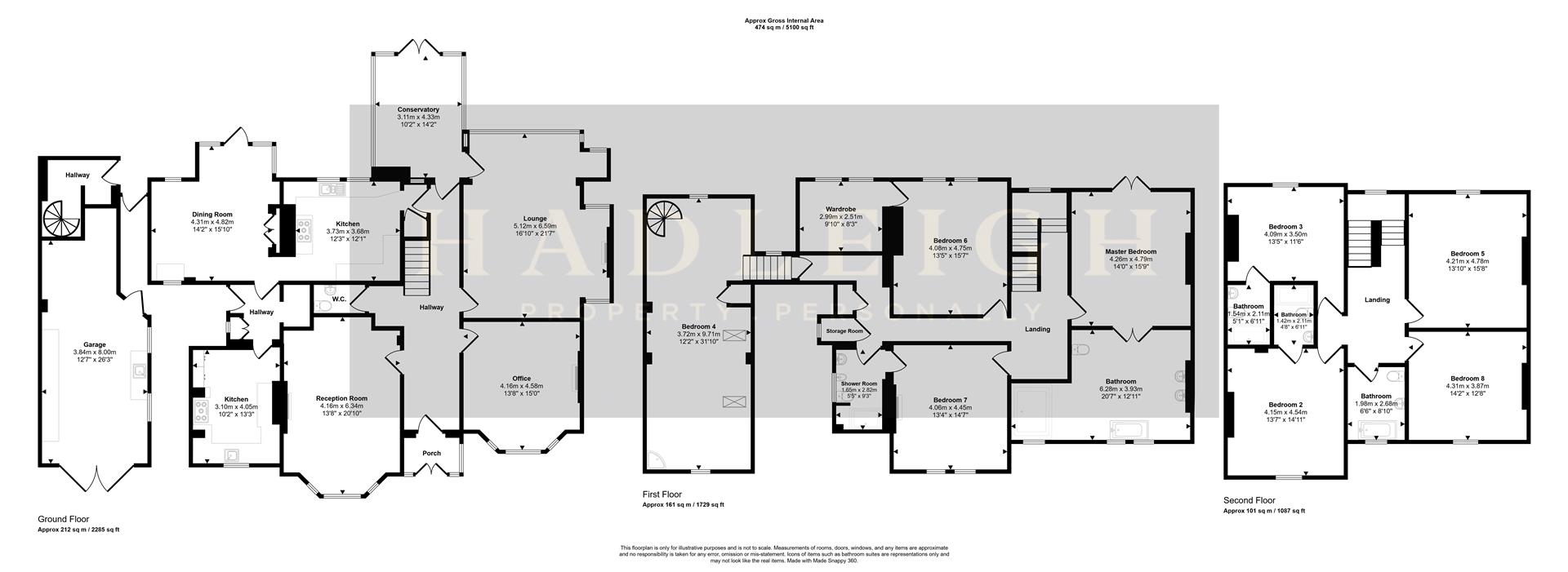 Boasting a large driveway, allowing parking for multiple vehicles. The property is set over three floors this detached home offers multiple reception rooms, two kitchens, spacious garage, conservatory and guest WC. The second floor accommodation offers 3/ 4 bedrooms with the potential for converting into multi purpose rooms, along with shower room. The master bedrooms offers a substantial bathroom. The second floor of the property further benefits from an additional four bedrooms, two complete with ensuite and additional house bathroom. To the side of the property is an extensive garage and to the rear is an extensive and private garden. The property further benefits from having solar panels.