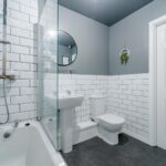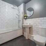Modern bathroom being partially tiled, fixed bath with mains shower over and handheld attachment. Low level flush WC, hand wash basin, towel radiator, ceiling light point and extractor fan.