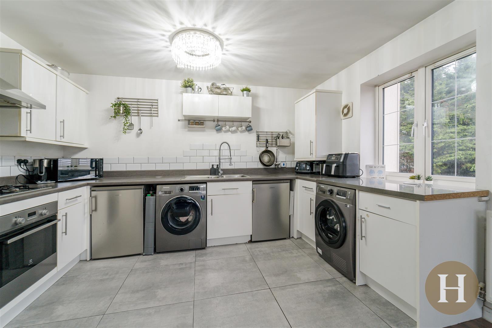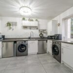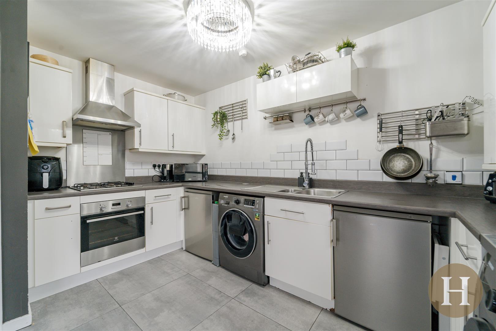Modern fitted kitchen with a range of base and wall units. Fitted oven, hob and extractor over. Tiled flooring and partially tiled splashbacks, sink and drainer unit along with plumbing for washing machine. Space for undercounter fidge and freezer, ceiling light point and double glazed window.