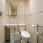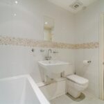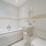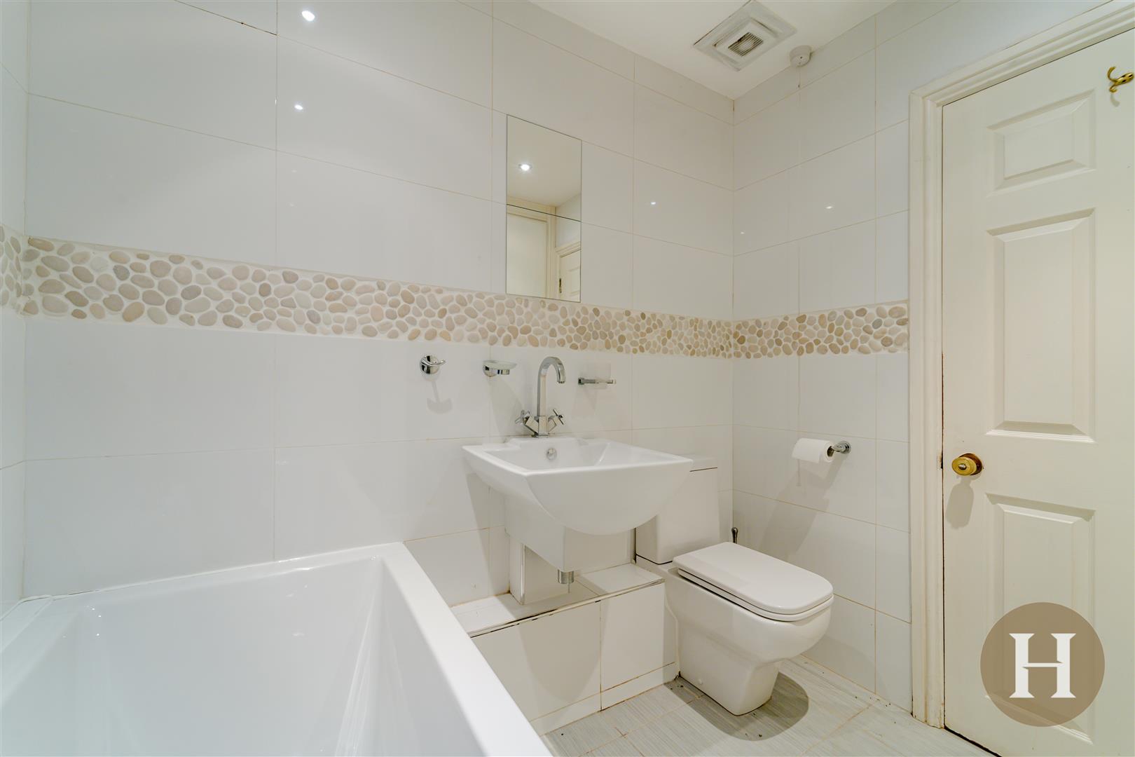 Modern bathroom suite with floor to ceiling tiling, low level flush WC, floating hand wash basin and fitted bath. Storage cupboard, mirrored radiator and ceiling light point.