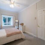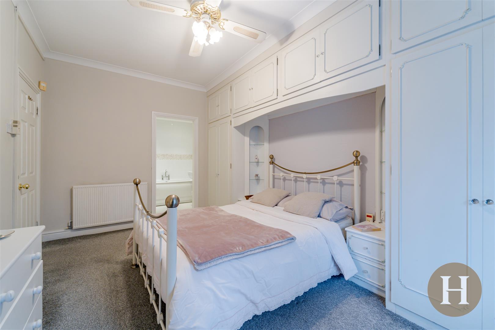 An excellent master bedroom boasting en-suite bathroom, bay window and fitted wardrobes. Radiator, ceiling fan and carpeted flooring.
