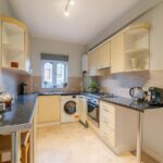 Fitted kitchen benefitting from a range of base and wall units, pluming for utilities including washing machine and dishwasher. Integrated oven, hob and extractor over, stainless steel sink and drainer unit. Windows to the side elevation, partially tiled splashbacks and housing boiler.